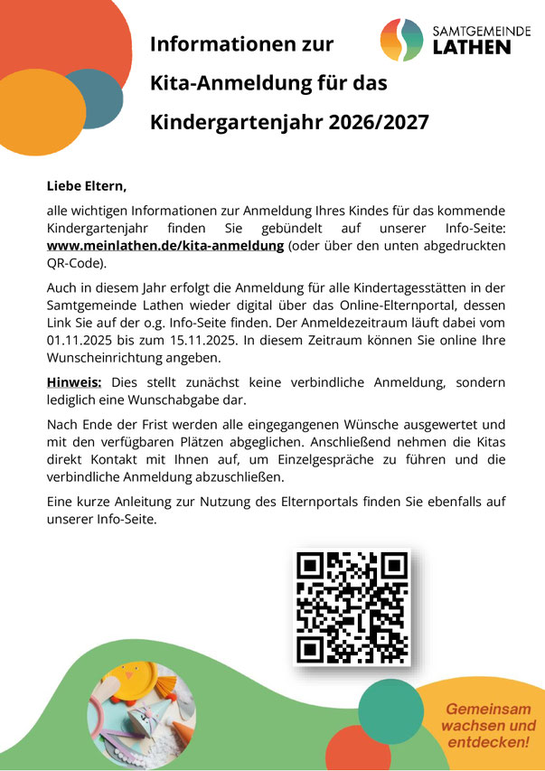 vom 01.11. bis zum 15.11. können Sie ihr Kind für die Betreuung in einer unserer Krippen- oder Regelgruppen anmelden.